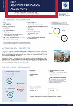 la SCPI AEW DIVERSIFICATION ALLEMAGNE ne présente aucune garantie de capital ou de performances. Votre investissement est donc exposé à un risque de perte en capital, notamment en cas de cession de parts ou de retrait.
