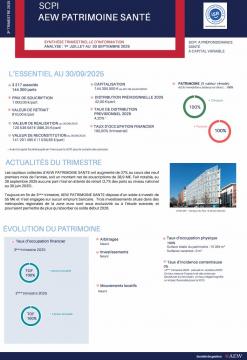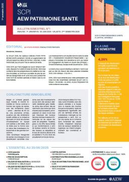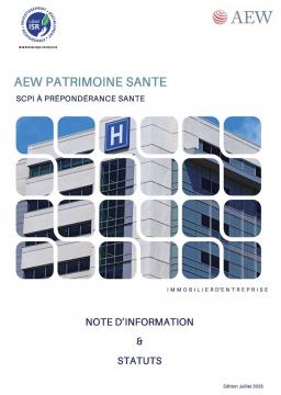 la SCPI AEW PATRIMOINE SANTE ne présente aucune garantie de capital ou de performances. Votre investissement est donc exposé à un risque de perte en capital, notamment en cas de cession de parts ou de retrait. |