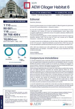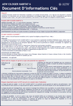 la SCPI AEW CILOGER HABITAT 6 ne présente aucune garantie de capital ou de performances. Votre investissement est donc exposé à un risque de perte en capital, notamment en cas de cession de parts ou lors de la liquidation du patrimoine. |