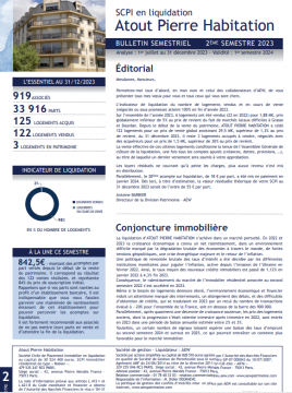 L'Assemblée Générale Ordinaire du 31 janvier 2025 a constaté que les opérations de liquidation d'ATOUT PIERRE HABITATION étaient terminées, a prononcé la clôture de ladite liquidation, a donné quitus au Liquidateur de sa gestion et l'a déchargé de son mandat.